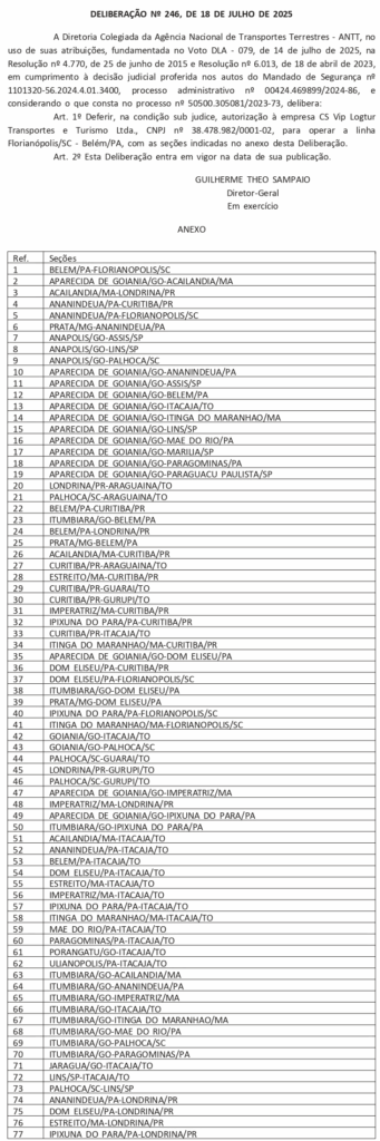 A Agência Nacional de Transportes Terrestres (ANTT) autorizou a operação de uma nova linha interestadual de ônibus entre Florianópolis (SC) e Belém (PA), atendendo a uma decisão judicial. A autorização, publicada no Diário Oficial da União na terça-feira (22), consta na Deliberação nº 246, de 18 de julho de 2025, e decorre do cumprimento de um mandado de segurança (nº 1101320-56.2024.4.01.3400). A empresa responsável será a CS Vip Logtur Transportes e Turismo Ltda, autorizada a operar em caráter sub judice.
