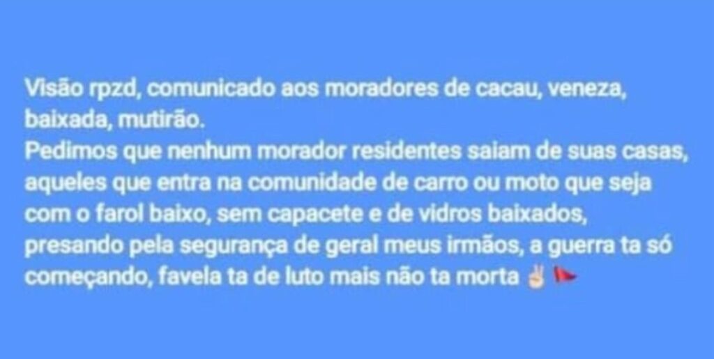 No dia seguinte, sexta-feira (1º), a facção divulgou um comunicado alertando os moradores das comunidades do Cacau, Veneza, Baixada e Mutirão para não saírem de casa nos próximos dias. A orientação é que quem circular de carro ou moto utilize faróis baixos, evite capacetes e mantenha os vidros abaixados, como forma de “preservar a segurança de todos”.