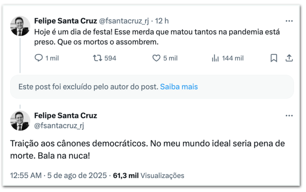 O ex-presidente da Ordem dos Advogados do Brasil (OAB), Felipe Santa Cruz, causou forte repercussão nas redes sociais ao afirmar que, em seu “mundo ideal”, o ex-presidente Jair Bolsonaro deveria receber “pena de morte, bala na nuca”. A declaração foi feita no X (antigo Twitter) nesta segunda-feira (5), após a notícia da prisão domiciliar de Bolsonaro, determinada pelo ministro Alexandre de Moraes, do Supremo Tribunal Federal (STF).