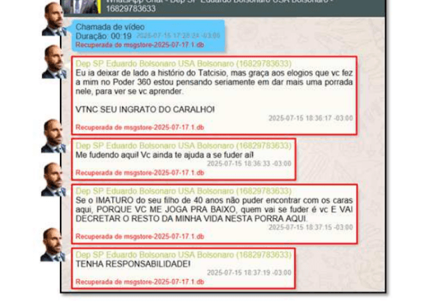De acordo com a Polícia Federal, as mensagens fazem parte do inquérito que investiga a atuação de Eduardo nos Estados Unidos, onde teria articulado medidas de pressão contra autoridades brasileiras. O relatório levou ao indiciamento de pai e filho por coação no curso do processo e tentativa de abolição violenta do Estado Democrático de Direito.